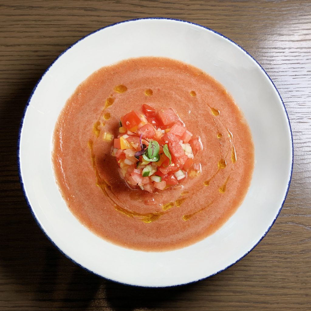 • LOCAL HEIRLOOM TOMATO GAZPACHO â€“ coriander oil, crumbled feta