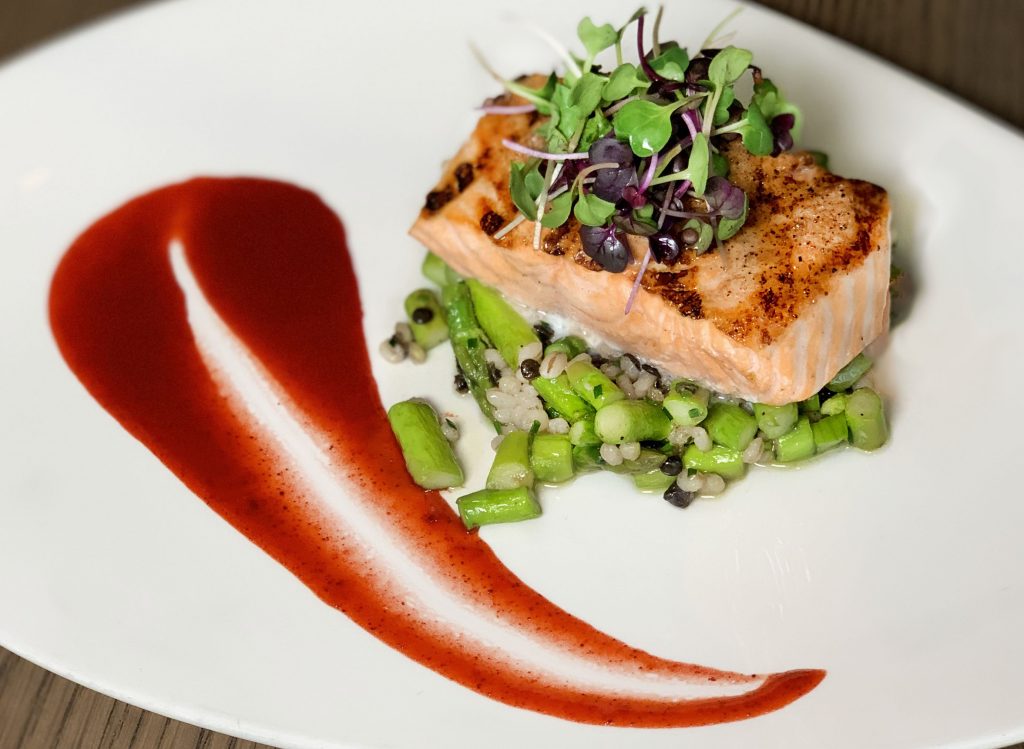 • SEARED SALMON ROLL â€“ fuji apple, puffed amaranth, yuzu miso