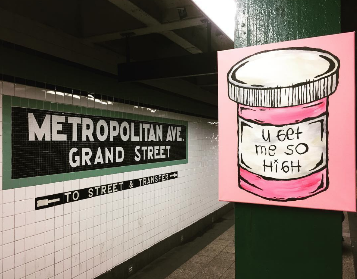 His controversial, yet iconic, pill bottle images appear on walls all over L.A. and now, street artist Dirt Cobain has brought his famous artwork to New York City. Often misunderstood for a drug reference, the pill bottle artwork is intended to represent anything that gives you a natural high. Wouldn’t it be cool to get ‘high’ without having to exploit illegal substances to get you there? According to the imagination of Cobain, we should be able to get high on anything in life; whether it’s love, music or art.